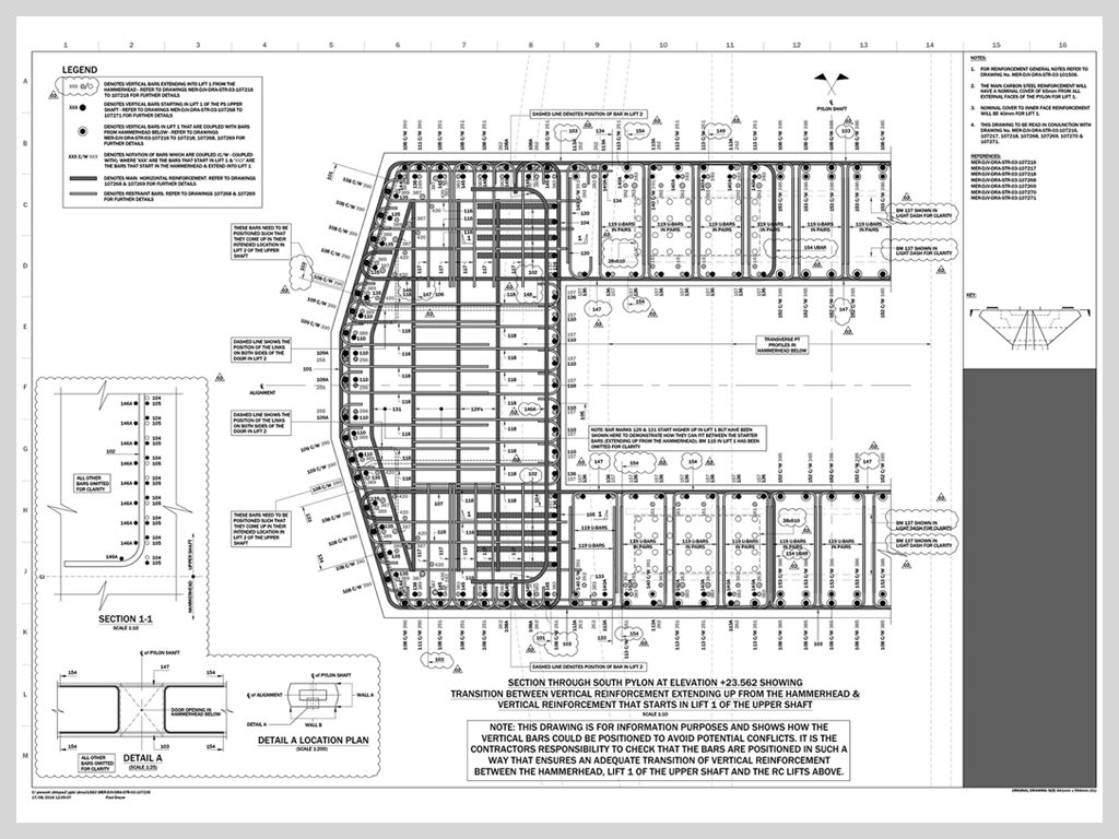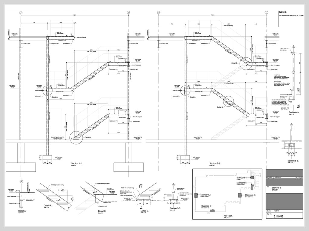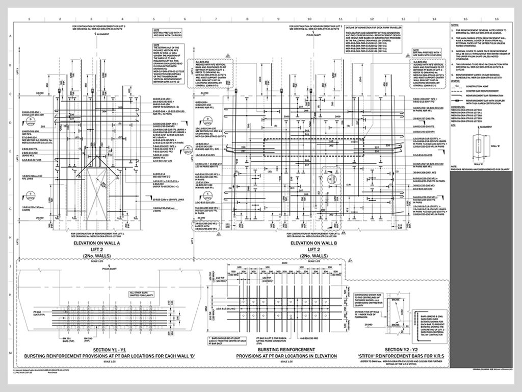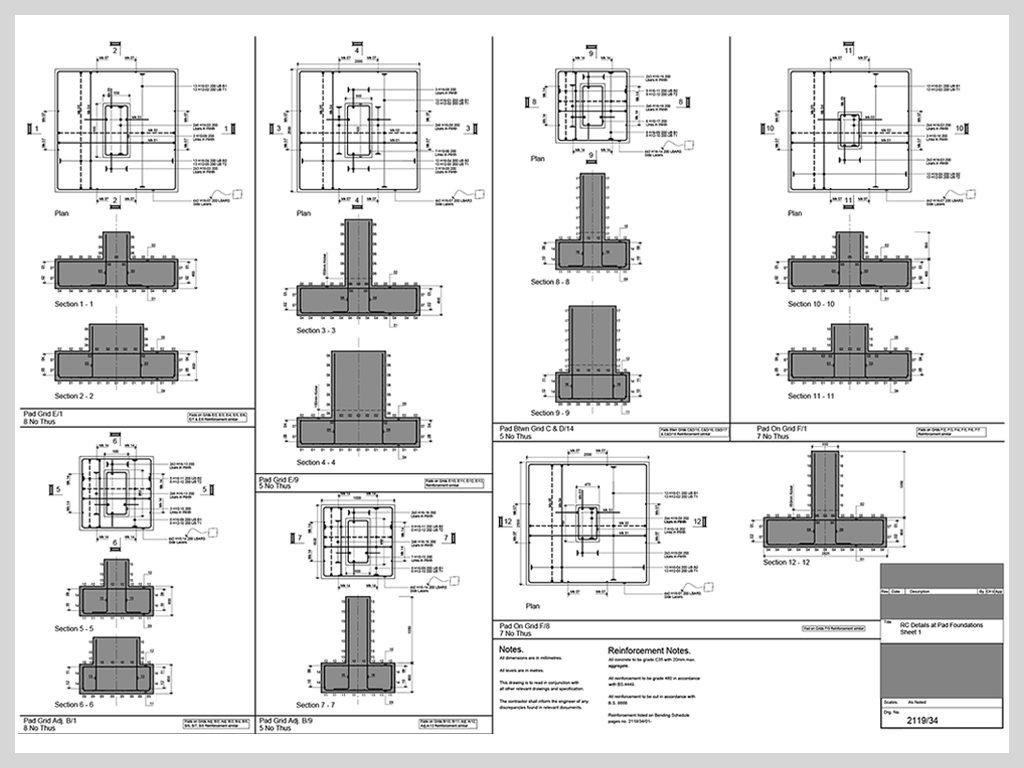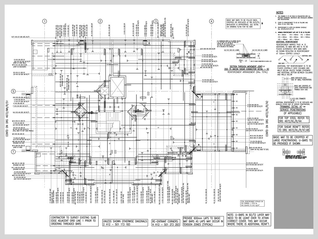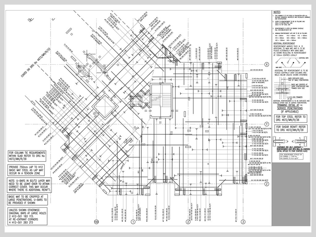 RC Detailing (main service). We can produce Reinforced Concrete drawings for all structural elements within the Civil and Structural Engineering environment. Including bridges, large multi-storey frames (residential and commercial), sub-structures, basement extensions, RC sequenced underpinning and large residential dwellings. These drawings can be produced using either AutoCad or CADSRC software. Projects are priced either by drawing rate (preferred) or, where necessary, lump sum basis.
